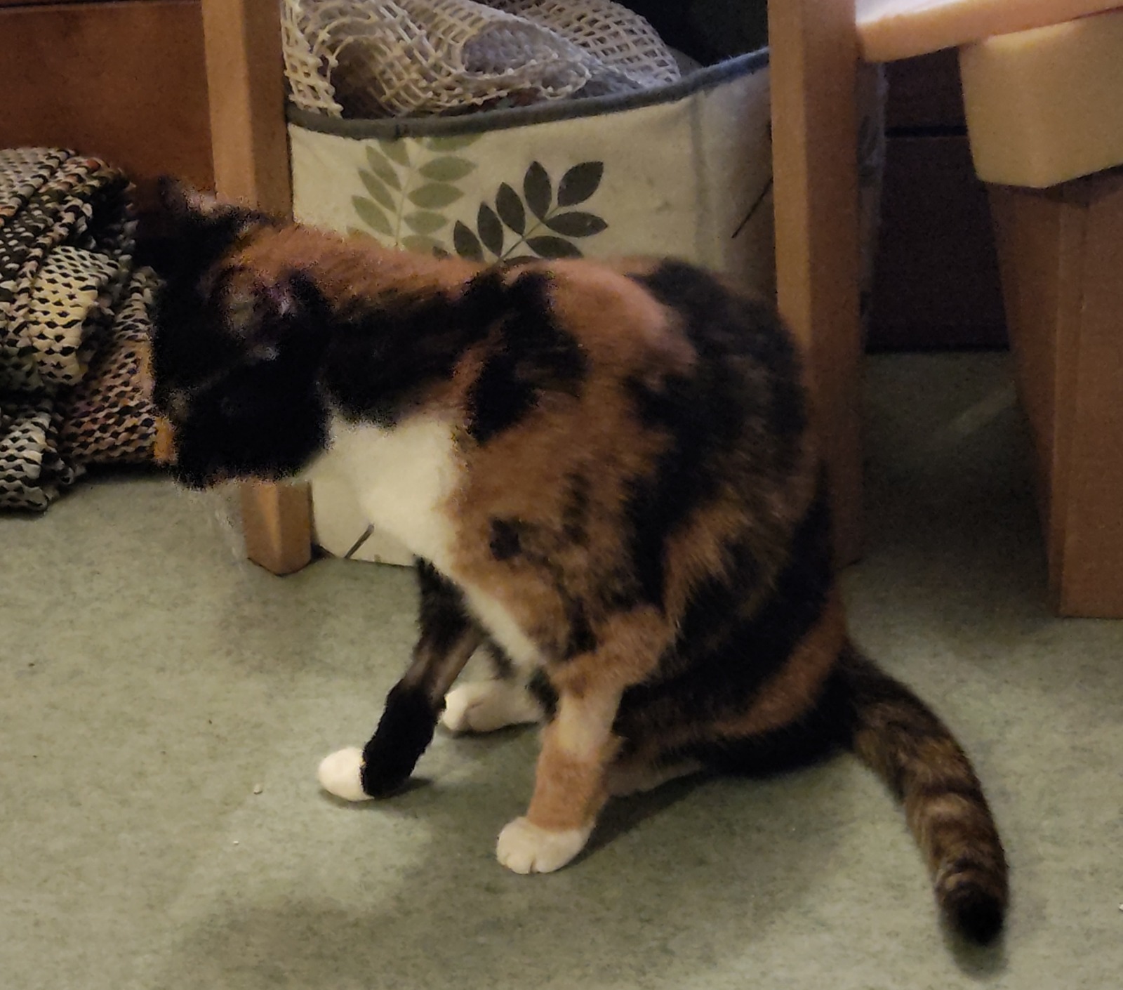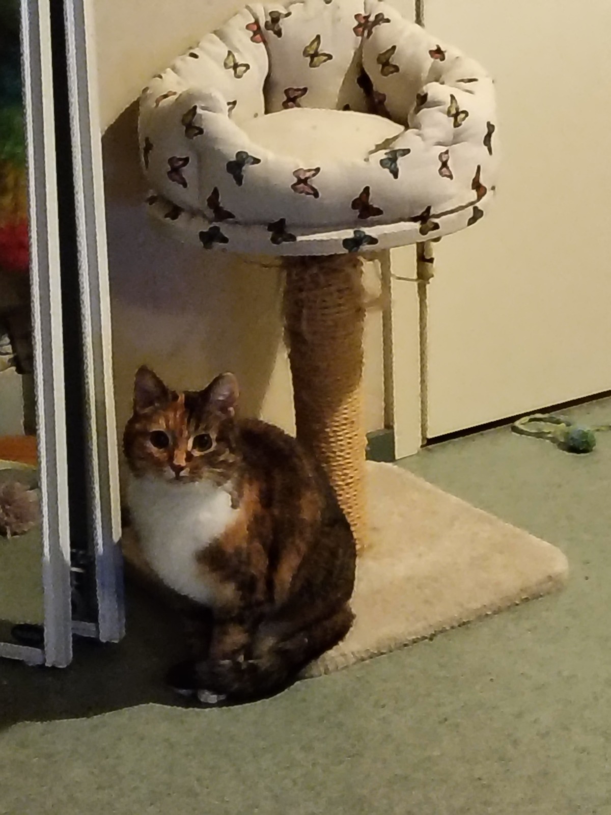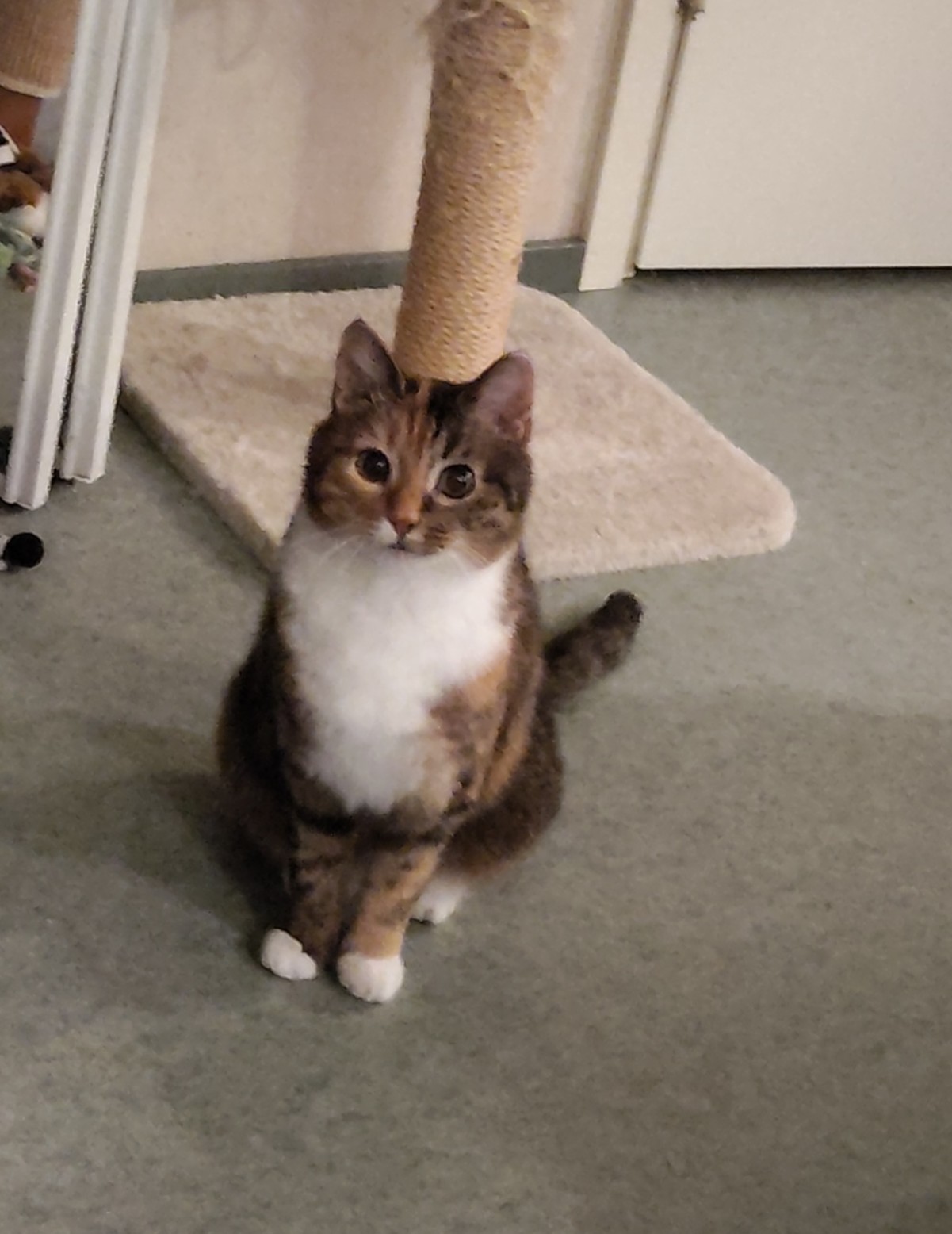 Pihka on hitaasti lämpenevää sorttia ja viihtyy edelleen enimmäkseen sohvan tai vuoteen alla. Tosin on nykyään jo ruoka-aikaan siskonsa kanssa pyörimässä jaloissa. Ja nyt on ruvennut äänikin löytymään. Tosin pieni ja hentoinen. Ja tulee välillä katsomaan mitä touhuan. Pihka ei paljoa leiki muuta kuin kuvassa olevan tornin ympärillä, mutta on kyllä osoittanut vapautumista leikkienkin suhteen ja saattaa silloin tällöin saada pienen hepulin.